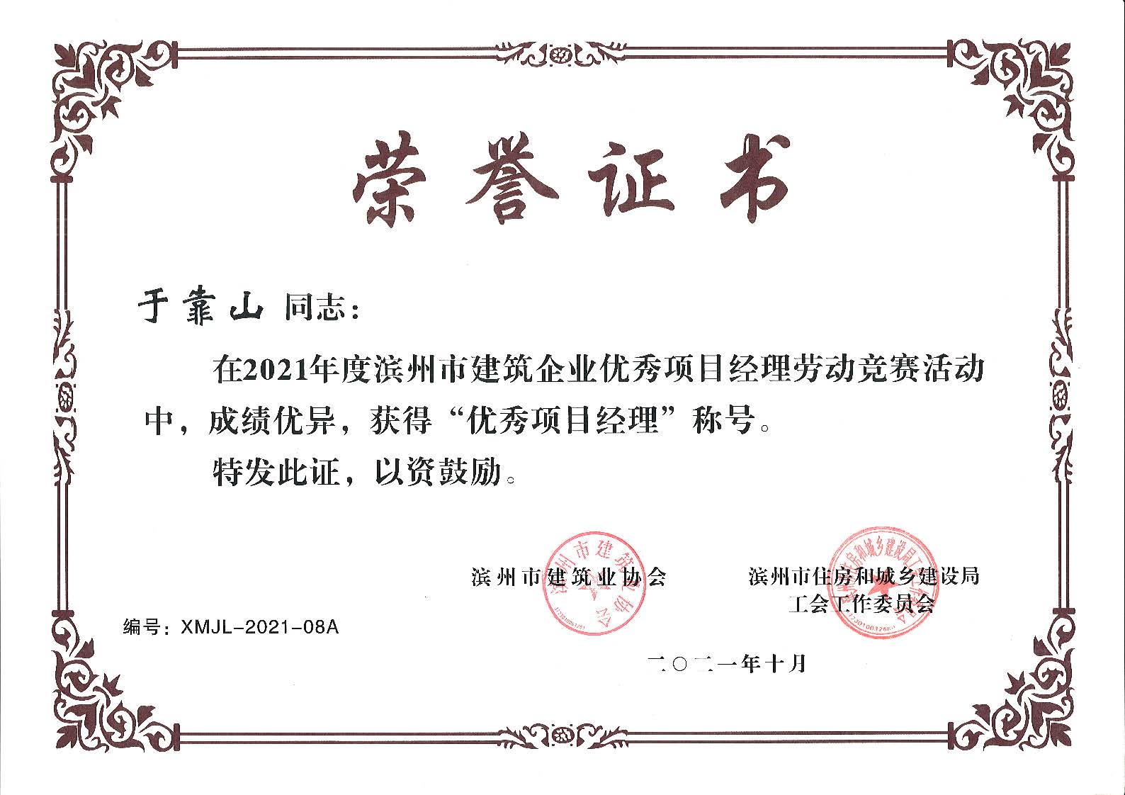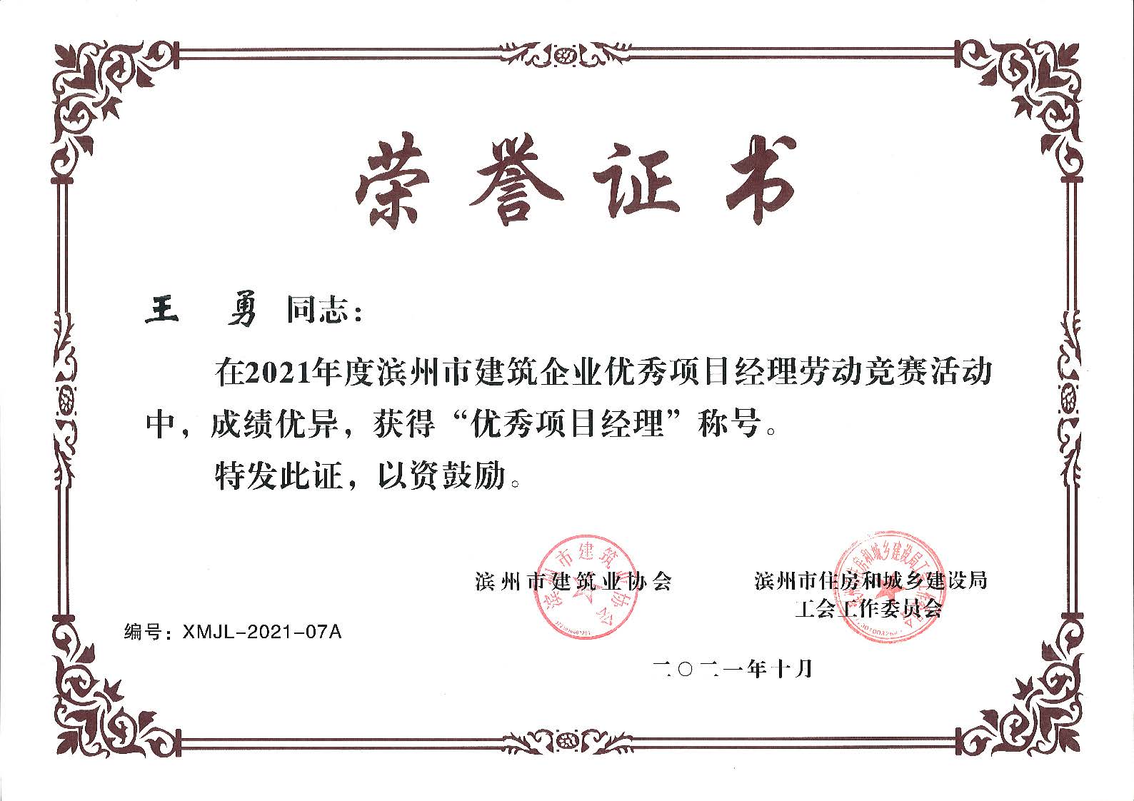 在濱州市住建局工會工委和濱州市建筑業(yè)協(xié)會組織的2021年度濱州市建筑企業(yè)優(yōu)秀項(xiàng)目經(jīng)理勞動競賽活動中,經(jīng)公司推薦、競賽工作委員會評議審定和綜合評審、網(wǎng)上公示等工作程序,我公司三名同志(王勇同志、房磊同志、于靠山同志)獲評“優(yōu)秀項(xiàng)目經(jīng)理”稱號。